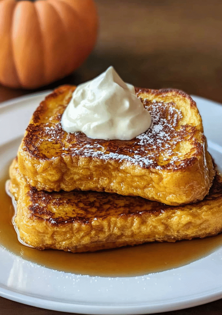 A cozy fall breakfast made with thick bread dipped in pumpkin-spice custard, pan-fried golden, and served with maple syrup. Simple, festive, and delicious!